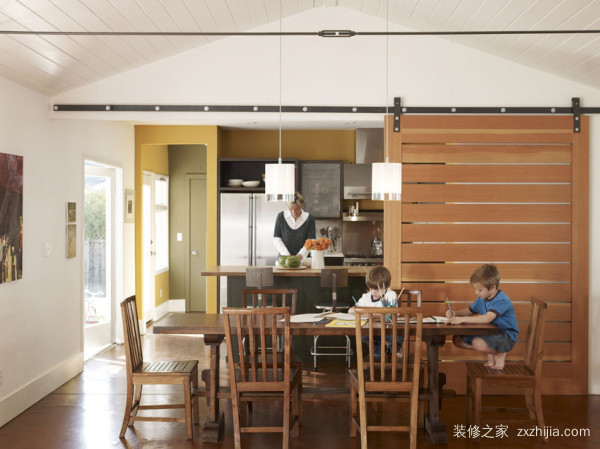 2.如果厨房局部开放,只有一个尺寸与餐厅相连,这样的油烟更容易处理。烹饪时,可以用玻璃、窗帘或其他东西遮挡。烹饪后,油烟排出后,也可以取下挡板。